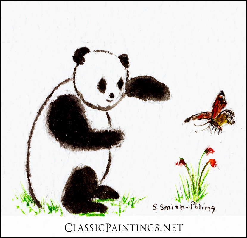 Pure transparent watercolor. During the rainy, dark winter what can be more fun than painting butterflies and pandas. Inspired by a visit to my daughter, Victoria in China while she was studying at the University of Chengdu. There is a panda reserve in Chengdu and it was fun to watch the pandas.