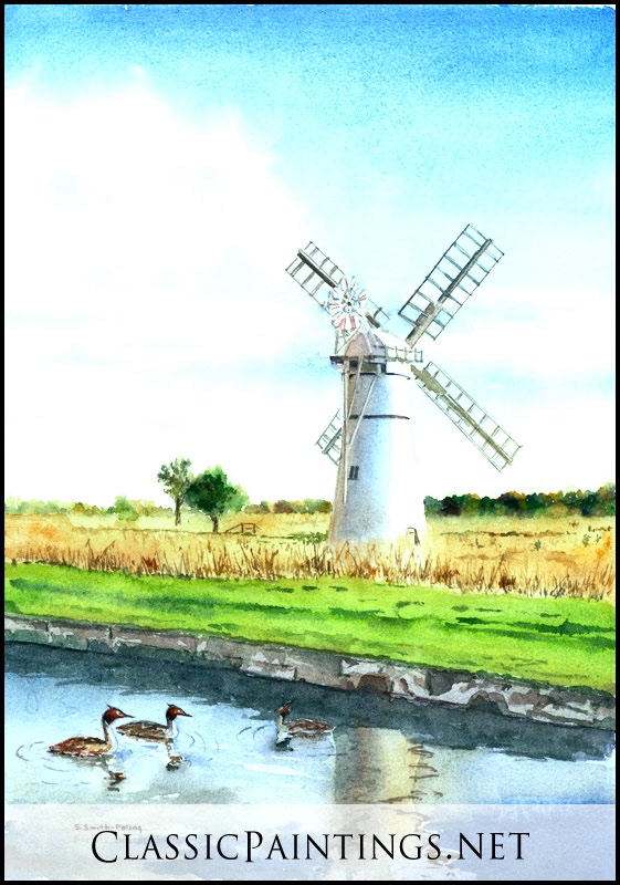 W/C The wetlands of East Anglia are beautiful. My husband and I rented a canal boat and spent 10 days slowly drifting along the canals. Mergansers, swans, grebes, and heron were just a few of the birds we saw. While docked at Thune Mill, I saw the Mergansers and had to paint them. The windmill pumps out water from the fields behind the dykes. The Broads were made in the 11-13th centuries by digging out the peat to heat the Abbey’s. The dug out areas would fill with seawater. Now there is a very large area to sail, or cruise and to just enjoy the wildlife.