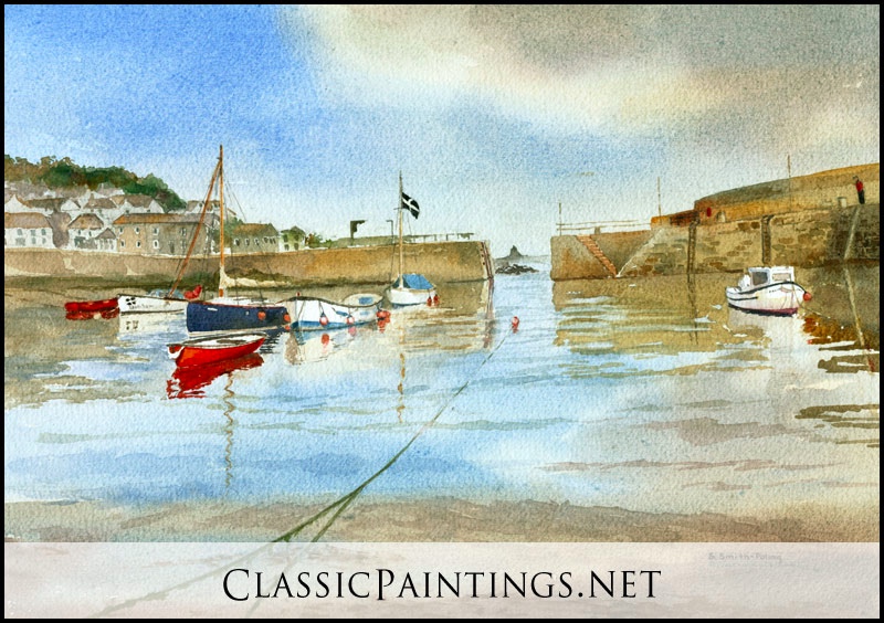 W/C Polperro, Cornwall. This morning was a high tide. These were the “classic” Polperro fishing boats. In the background is the Smuggler’s Museum. It was so calm and beautiful this morning that I just had to paint it.