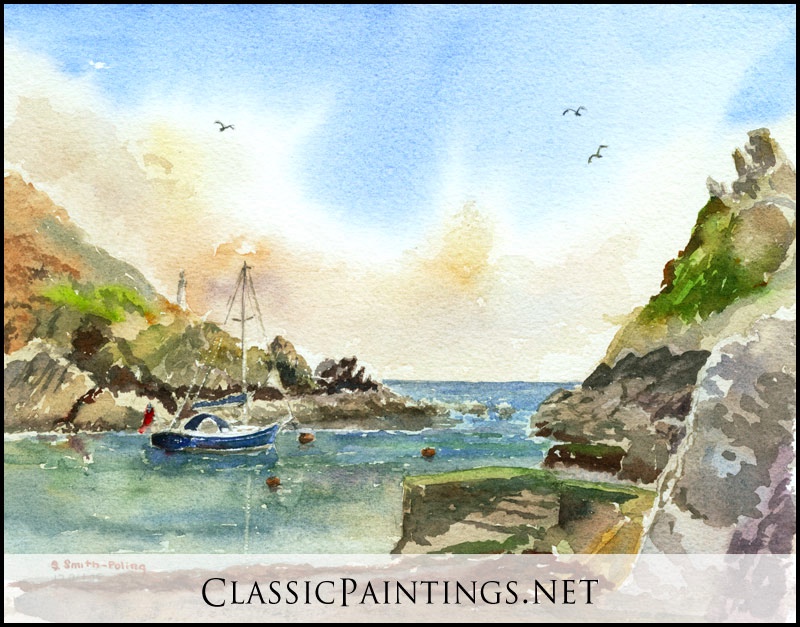 W/C Mousehole, Cornwall is truly one of the loveliest fishing villages in Cornwall. The warm, late afternoon light gave a beautiful glow. In the 1960’s I spent delightful painting trips with my father, Craig Smith. I would bring him crab sandwiches as he painted in the harbor. Now I am painting in his place.