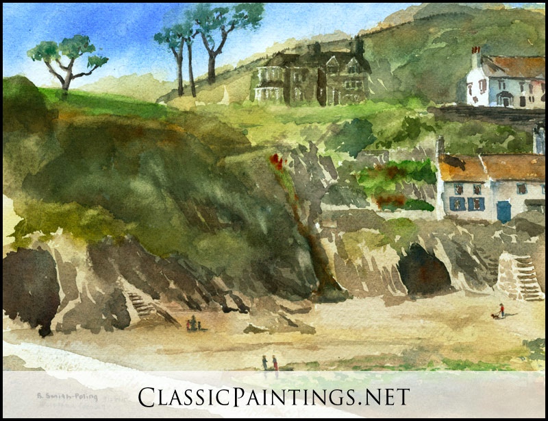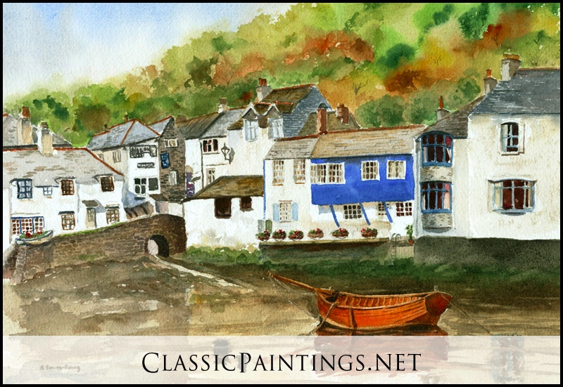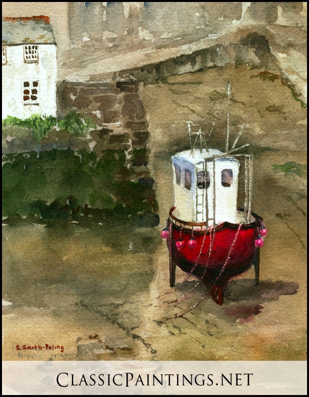 W/C Polperro, Cornwall. When the tide is out, the boats often lean to the side. Some of them have Lee boards, Gar boards, Skids or twin keels to help keep them upright. During the low tide, the sailors will often be out painting, scrapping or doing repair work on their boats.