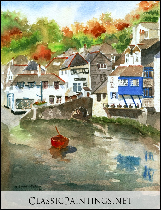 W/C Polperro, Cornwall. This is the old Forge. I found the roman style bridge and the autumn colors fascinating. My husband, Mitch and two friends Rod and Marilyn rented an apartment for a month so Rod and I could paint! It was fantastic. Everywhere one turns in Polperro there is wonderful subjects to paint.
