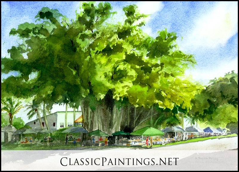 Archival Print from original watercolor. Hawi is a delightful art village on the north side of the “Big Island” of Hawaii. The Saturday farmers market was wonderful with local fruits, vegetables, eggs and fermented foods and even some traditional smoked salmon from Alaska brought by the snowbirds! Originally it was a cane sugar plantation town. Towns people kept it going after the plantations closed. January was beautiful, green and fresh I just loved the banyan tree and market.