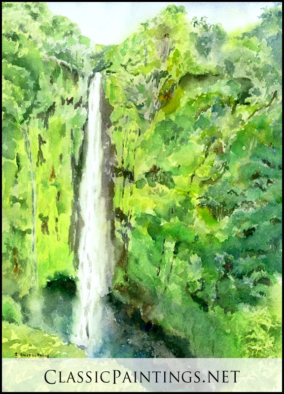 Print from original watercolor. The Akaka Falls are beautiful on the Northeast side of the “Big Island” of Hawaii. January was beautiful, green and fresh and the falls just begged to be painted.