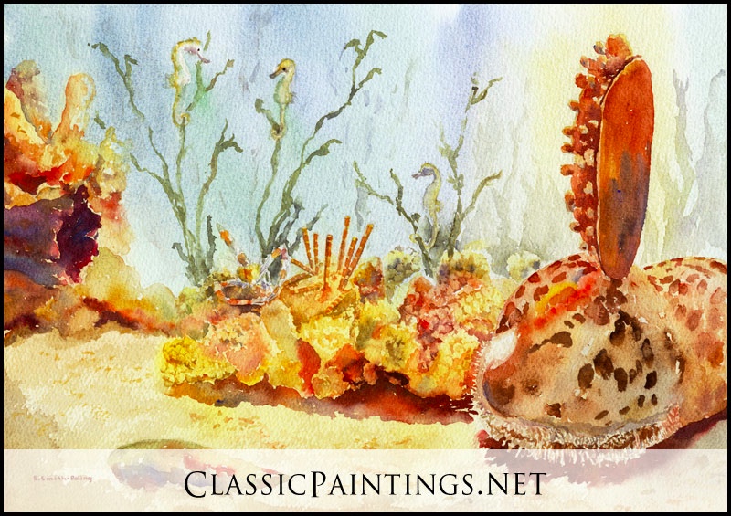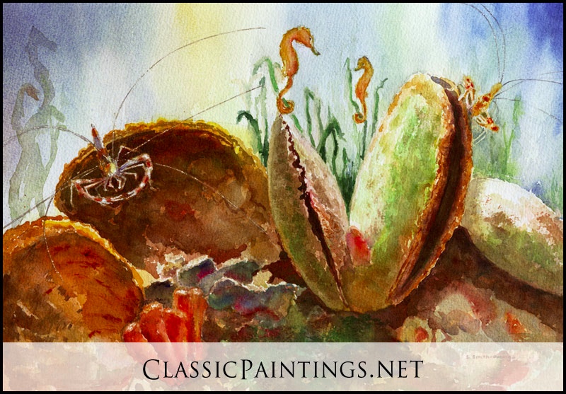 Print from original watercolor. Maui is just beautiful and fun. The Maui Ocean Center* is a delightful aquarium in which to study and just enjoy the underwater flora and fauna. Here is a scene with shrimps and shells. It was fun to see and to paint. *